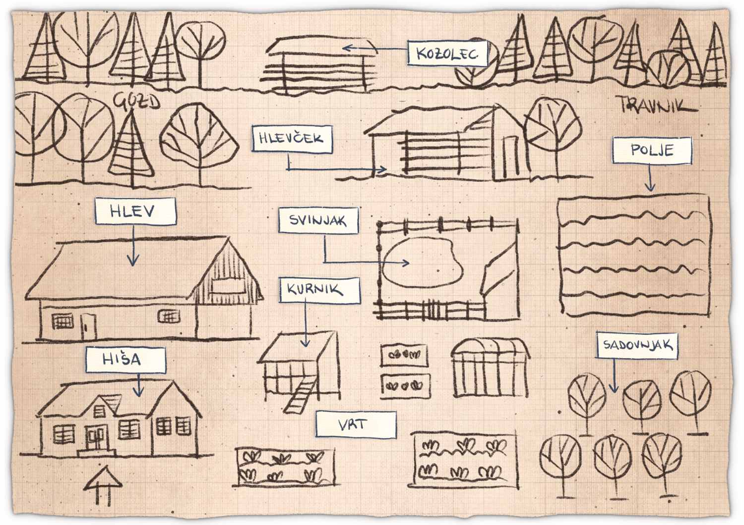 Ilustracije za drugo knjigo Klare Lombar, Skica kmetije strica Matije.